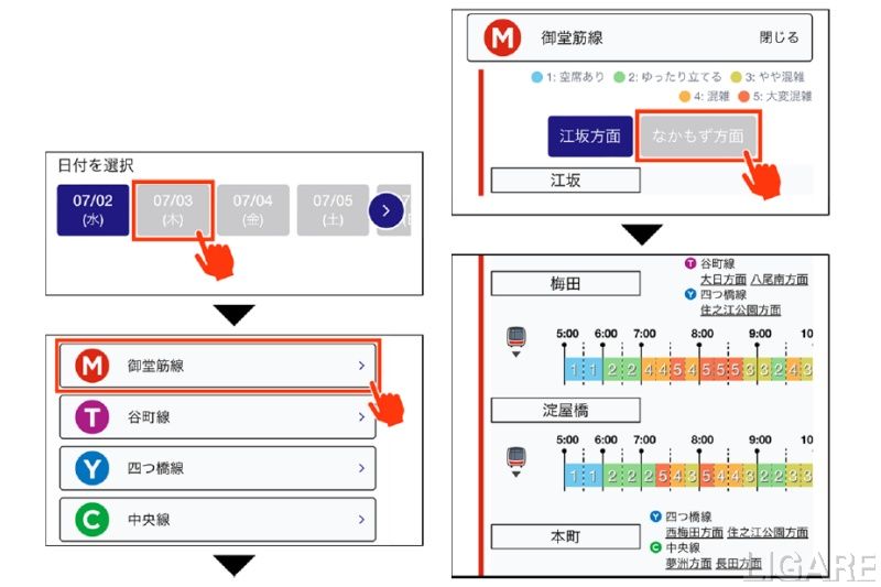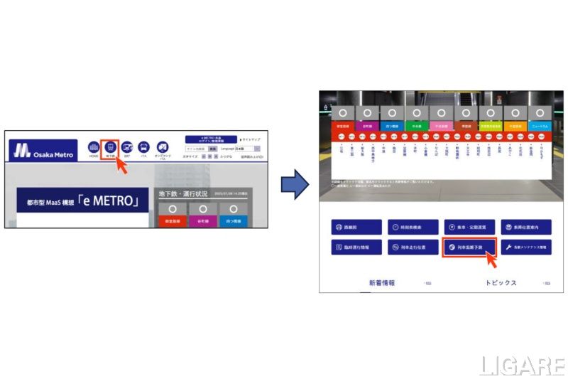 大阪市高速電気軌道(以下、Osaka Metro)は7月24日、Osaka Metro全路線の列車混雑予測情報をe METROアプリとOsaka Metro公式ホームページで確認できるサービスを7月31日より開始すると発表した。