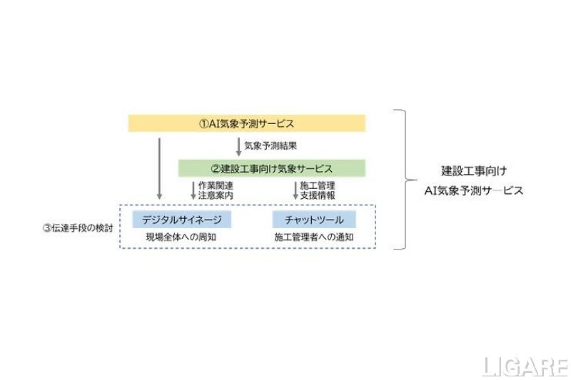 両社は、2022年5月から共同で、気象が建設工事に与える影響および建設現場での気象予測ニーズに関する調査を開始した。同時に、2025年大阪・関西万博の開催予定地である夢洲(ゆめしま)エリアを対象とし、過去の気象観測データを用い、予測の精度を評価してきた。その結果、建設現場で求められる気象情報の仕様、および夢洲エリアの気象傾向をAIに学習させることで予測精度を高められる可能性があることなどを確認している。