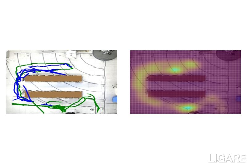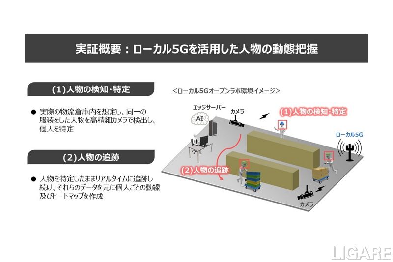 今回の実証実験では、物流倉庫を模した疑似的な環境とローカル5Gを通じた高精細カメラでの撮影環境を構築した。実際に物流現場で想定される動作を複数人で行い、その映像データをAIで分析した。これにより、人物の検知・特定および追跡(動線把握、ヒートマップ化)において物流現場への適用可能性を確認している。