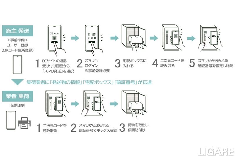 また、「e-COMBO LIGHT」は、戸建て住宅でEC商品・レンタル商品などの発送・返品・返却を行うことができる(SMARI対応タイプ)。EC等で購入した商品の発送・返品やレンタルサービスを、宅配業者やコンビニエンスストアに持ち込むことなく自宅から非対面で発送することが可能だ。ほかにも、サブスクリプションサービスなどの返却、商品修理や補修のための発送作業にも利用できる。SMARI宅配ボックス発送サービスは、現時点で約20社と提携している。