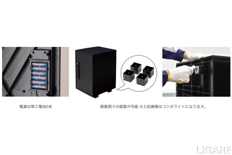 くわえて、「e-COMBO LIGHT」では、電池式(単三電池6本)のため電源工事は不要となっている。設置には専用工具を使用せず接着剤で施工する台座により、専門業者ではなく施主が自分で設置することもできる。さらに、「e-COMBO LIGHT」は、パスコードで開け閉めできるキーレス仕様となっており、あらかじめ設定したパスコードを入力することで解錠可能だ。