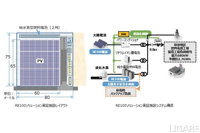 同施設は、滋賀県草津拠点に5kW純水素型燃料電池99台(495kW)と太陽電池(約570kW)を組み合わせた自家発電設備、さらに余剰電力を蓄えるリチウムイオン蓄電池(約1.1MWh)を備えた実証施設だ。ここで発電した電力で草津拠点内にある燃料電池工場の製造部門の全使用電力を賄うとともに、3電池連携による最適な電力需給運用に関する技術開発および検証を行う。