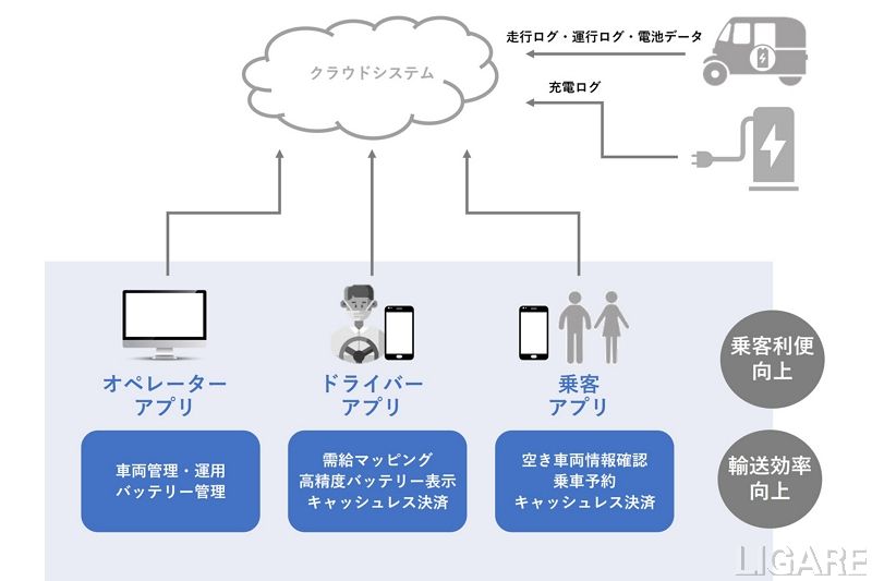 また、同システムは、オンデマンド運行管理、配車アルゴリズム、バッテリーマネジメントの機能を有するクラウドシステムだ。Eモビリティ用充電器利用の認証・情報やEモビリティの車両・運行情報をモバイル通信でクラウド上に取り込み、オペレーター(車両運用事業者)・ドライバー・乗客向けの3つのアプリを介して、さまざまな機能を提供する。