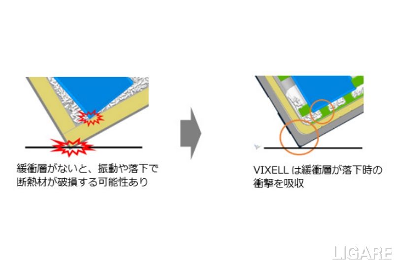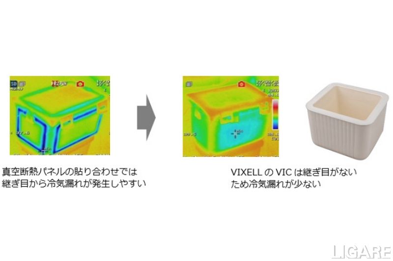 VIXELLには、耐久性に優れ、電波を透過するという特徴がある。VICの周囲を樹脂シートで覆い外側と内側に緩衝層を設けたことで、耐久性が向上した。また一般的な真空断熱パネルと異なりアルミフィルムで覆われていないため、通信用電波や磁界が透過する。これにより、ボックス内に温度やGPSなどのセンサーを設置することで開封することなく、ボックス内の状態を監視することが可能だ。