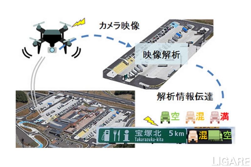 NEXCO西日本は、E1A新名神高速道路宝塚北サービスエリアにおいて、5Gのサービス提供を開始した。同実証実験は、無人航空機(以下、UAV)※に搭載されたカメラの高精細映像を、5Gの高速・大容量を活用して情報伝達することで、より速く、より正確に混雑状況を把握し、ユーザーへ情報提供する。