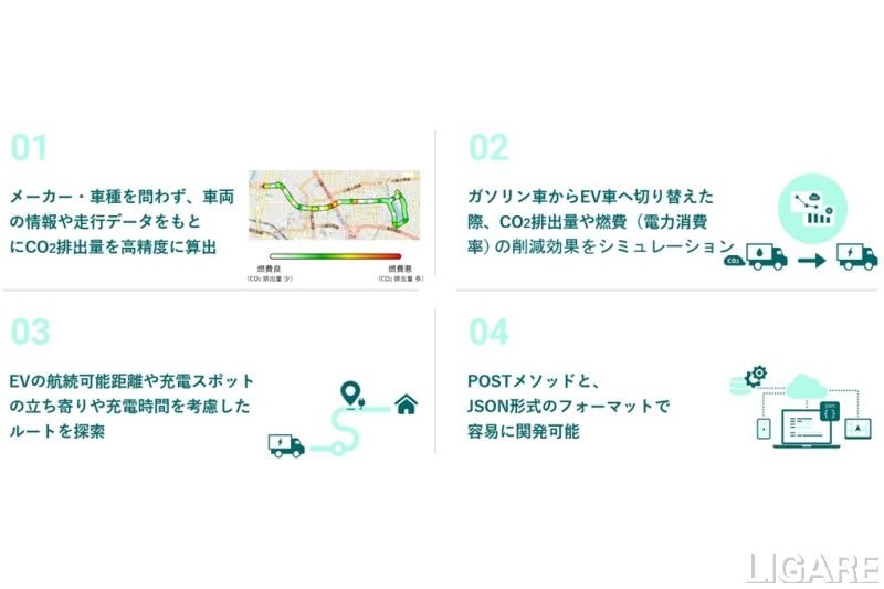 提供を始めた新サービスのうち、「カーボンニュートラルAPI」は、「EVルート探索」「到達可能範囲」「充電スポット検索」「CO2排出量算出」の4種で構成される、EV導入の課題を解決するためのAPI。