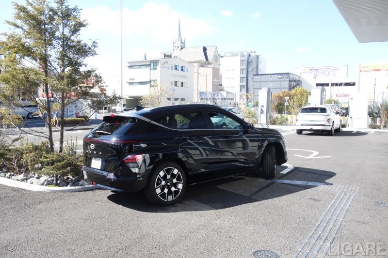 試乗したKONAの電池容量は64.8kWh(ベースグレードのCasualのみ48.6kWh)なので、ゼロから満充電にするなら、45kWの急速充電で84分、6kW普通充電で11時間ほどの計算。なお、家庭での電気代は指標として使われることが多い「電力料金目安単価」※31円/kWh(税込み)で考えると、64.8kWhなら2009円。