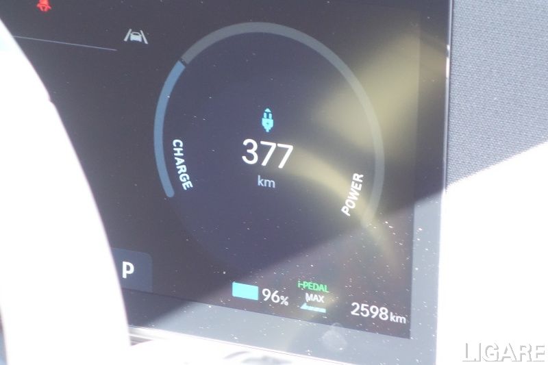 USBがType Cなのにも「感動」。回生ブレーキパドルや、360度の高画質映像で駐車をサポートする「サラウンドビューモニター」機能にも驚きの声を上げた。KONAをさっそうと駆り、道山さんはCXCから7日間のBEV体験に出発した。スタート時は充電96%で、航続可能距離は377キロ。