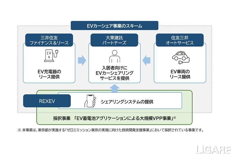 今回の取り組みは、大東建託グループの大東建託パートナーズ株式会社(以下、大東建託パートナーズ)、三井住友ファイナンス&リース株式会社、住友三井オートサービス株式会社と共同で実施する。同サービスの対象は、大東建託パートナーズが管理する賃貸住宅の入居者だ。