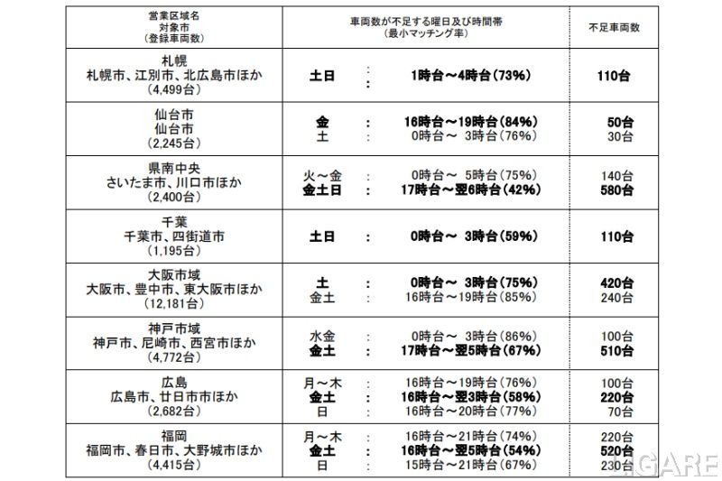 国交省は、タクシーの営業区域8カ所で、タクシー配車アプリのデータに基づいてタクシーの不足車両数を調査した。配車マッチング率90%を確保するために必要な車両の数を不足車両数と位置付けた。