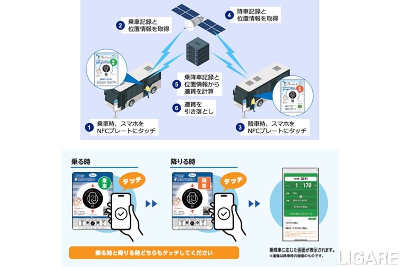 同実証は、両備バス、中国バス、KDDI株式会社(以下、KDDI)の3社で実施する。「スマホタッチ支払い」は、スマートフォンで専用URLにアクセスし、クレジットカードを登録することで路線バスの乗降車が可能になるサービスだ。バス車内に設置されたNFCタグにスマートフォンをかざすだけでバスの利用・決済ができる。車両ごとのICカードリーダーの導入が不要な機器構成であり、キャッシュレス決済による利便性向上と維持コスト削減の両立を実現する。