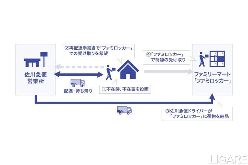 今回の取り組みでは、荷受人が、不在連絡票等からWebサイト上で受け取り場所として受け取り可能な「ファミロッカー」を選択し、申し込むことができる。その後、佐川急便が指定された「ファミロッカー」に荷物を納品し、荷受人へ受取準備完了のメールを配信するという流れだ。
