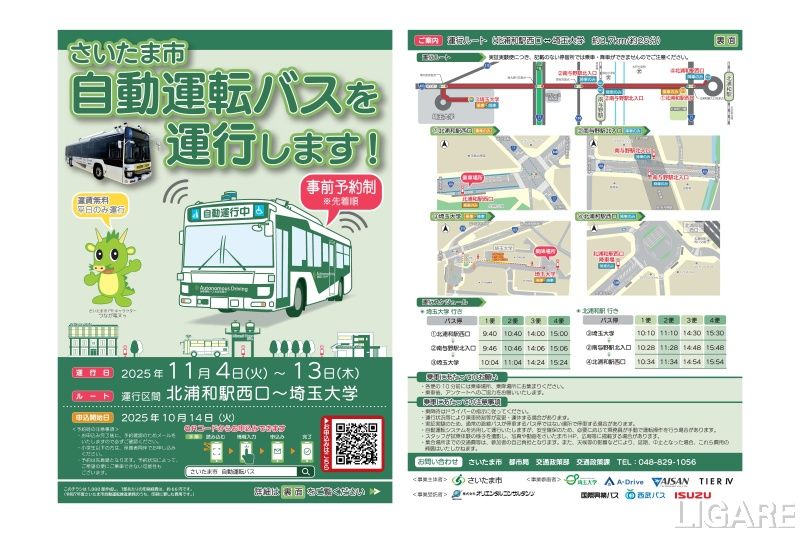 さいたま市は10月14日、一般国道463号(埼大通り)において、大型バスによる自動運転実証実験の一般試乗を令和7年11月4日~11月13日(土日除く)に実施すると発表した。