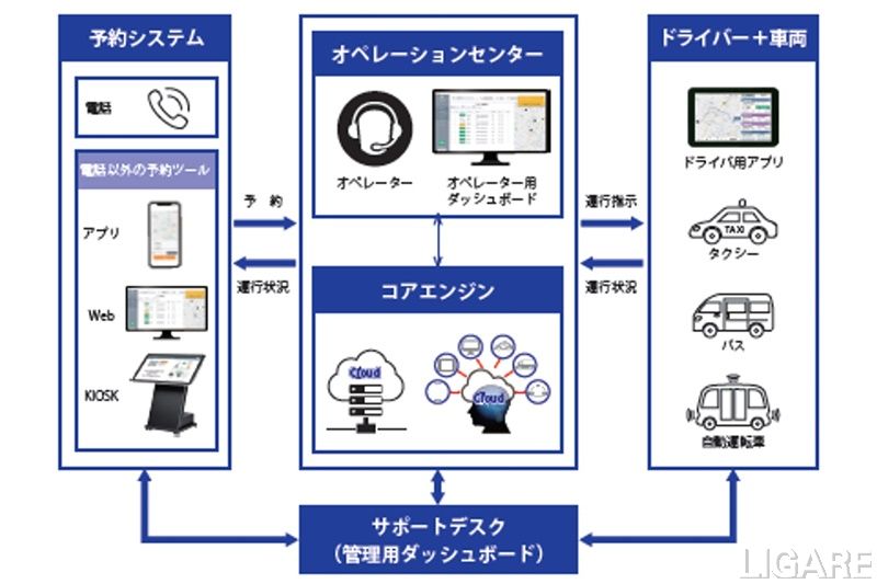 「オンデマンドモビリティプラットフォームサービス」では電話、アプリやWEBなどの予約方法を提供する。ドライバー用アプリでは乗車位置や降車位置、運行ルート、乗車人数などを案内し、運行負担の軽減を図る。オペレーションセンターでは電話とコンピューターの統合システムにより、電話着信から即座に利用者名や利用情報などを表示し、オペレーターの業務を効率化する。またコアエンジンは、最適アルゴリズムによって配車効率の自動最大化を行う。