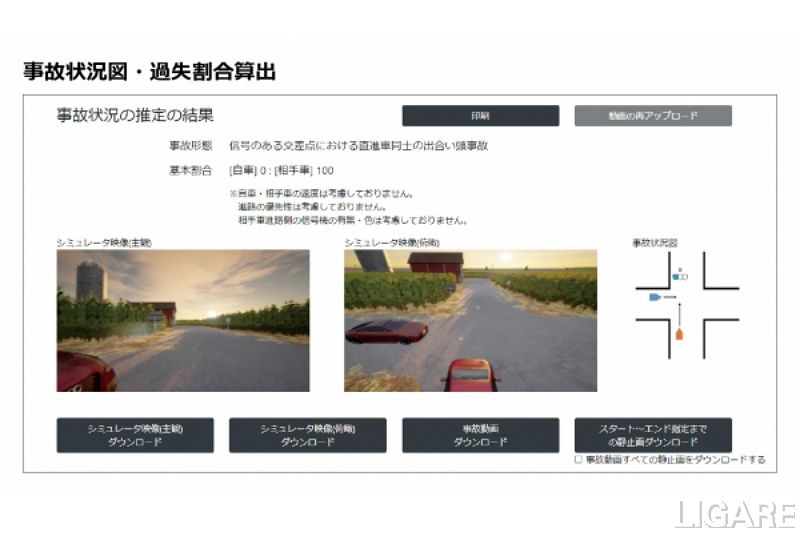 今回の事故状況推定システムは、ウタゴエ株式会社と共同で開発したAI画像処理技術を用い、ドライブレコーダーの録画データから「交差点形態」、「自車・相手車の進行方向」、「信号機の有無・色」を識別・抽出する。過去の判決事例をもとに作成したデータベースとパターンマッチングすることで、事故形態と基本過失割合、事故状況図を出力でき、誰でも客観的かつスピーディーに事故状況の判定が可能だ。さらに、事故状況の理解を助ける、3D化した主観・俯瞰視点のシミュレーター映像をダウンロードできる。