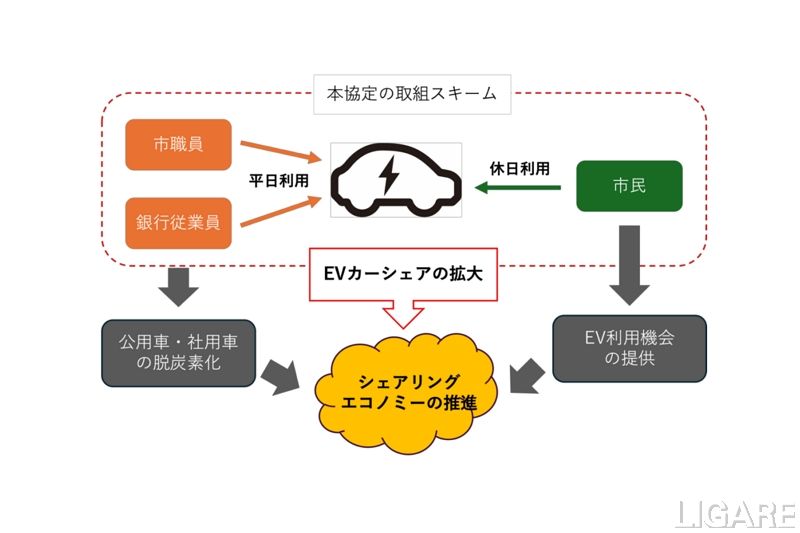 今回の協定の目的は、公用車・社有車の脱炭素化を図るとともに、市民にEVを体感してもらう機会を提供することだ。これにより、EVのさらなる普及や事業者・市民を含めたシェアリングエコノミーの推進を図る。