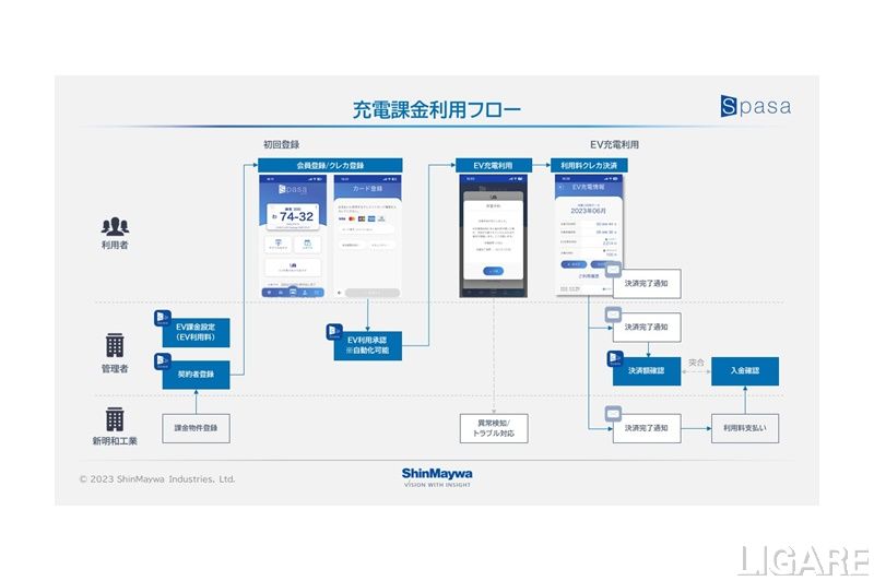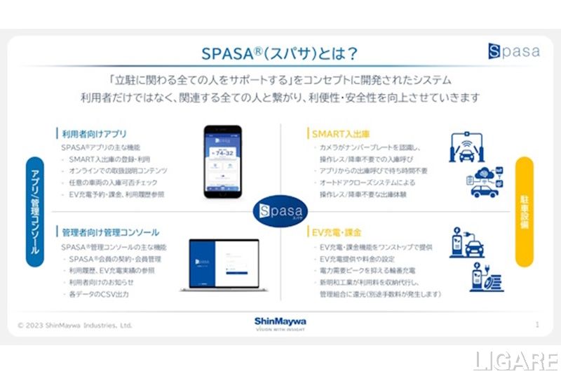 また、マンション等の集合住宅が同サービスを導入した場合、利用者は自身のスマートフォンにインストールしたアプリ「SPASA」を通じて充電予約ができる。さらに、同サービスには、新明和工業が管理組合に代わって利用者から費用を徴収し、管理組合の口座振り込みまで引き受けるサービスを含んでいるという。