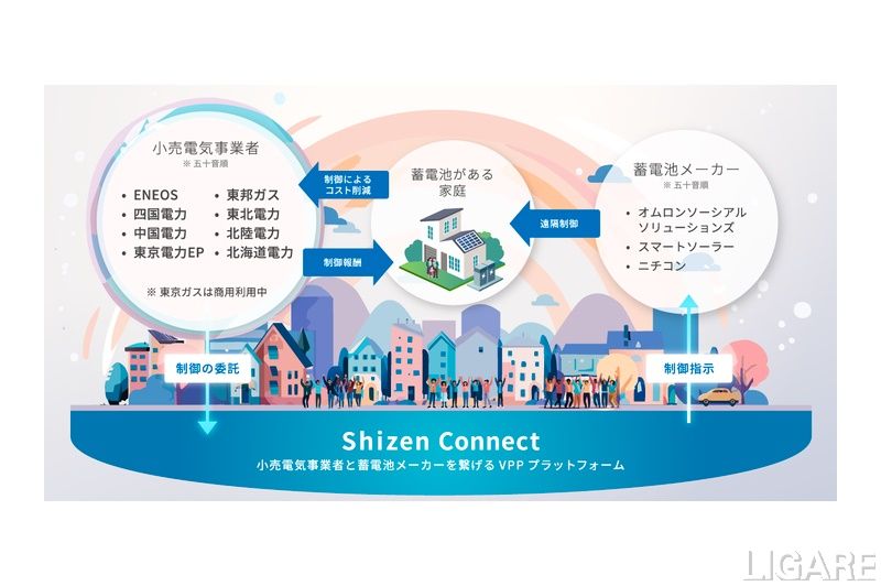 株式会社、ニチコン株式会社等の蓄電池メーカーとの協業により提供している低圧VPP運用サービスだ。Shizen Connectのエネルギー管理システム「Shizen Connect」を活用し、家庭用蓄電池などの低圧エネルギー機器に対し、充放電を遠隔制御。これにより、VPP(仮想発電所)を構築の上、調整力を創出し、小売電気事業者の電力調達コスト削減等に寄与する。