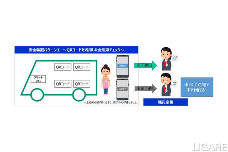 さらに、同実証では、2つのパターンを検証する。1つ目はバスの全座席にQRコードを設置し、子供が降車した後に職員等がスマートフォンアプリ「車内見守り用アプリ(仮称)」でQRコードを読み取るというものだ。2つ目のパターンでは、子供の通園かばん等にビーコンタグを入れておき、子供が降車した後に職員が同アプリを使い、ビーコンタグの電波が残っていないか確認する。