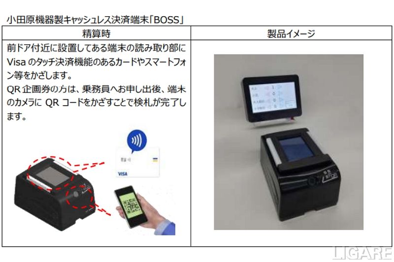 また、同実証実験では、小田原機器製キャッシュレス決済端末「BOSS」を利用する。乗車運賃の支払いは、乗車時(ポートループでは降車時)にVisaのタッチ決済機能のあるカードやスマートフォン等を機器にかざすことで、決済をスピーディーに完了する。