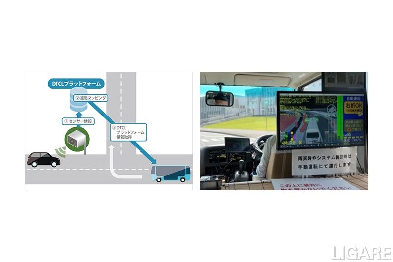 また、同実証では、「右折時の対向車検知」と「信号機の灯火予測による快適で安全な車両の運行」を行っている。「右折時の対向車検知」では、建物の屋上に設置したセンサーの情報を通信を介して共有することで、車両だけでは認識できないエリアを補完する。これにより、車両が認識するエリアを拡張することが可能となる。今回の実証では、SFC内の右折ポイントにおいて対向直進車の情報を、「DTCLプラットフォーム」からリアルタイムに取得できるようにしている。