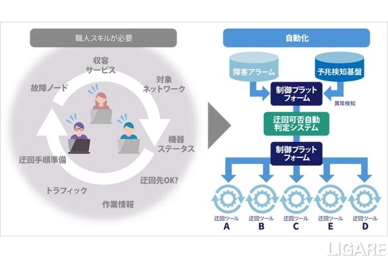 今回開発した運用自動化システムの特長は、迂回可否自動判定システムと予兆検知基盤だ。迂回可否自動判定システムでは、機器や関連システムから取得した設定情報やステータス情報、作業情報、アラーム情報をほぼリアルタイムに収集し、ネットワークの構成変化に特化したデジタルツイン上で状況を分析。これにより、実際の状態に基づいた自動判定を実現し、サービス復旧までの時間を大幅に短縮する。また、監視工数の削減や個人のスキルに依存しない安定的な運用体制の構築にも寄与しているという。一方、予兆検知基盤では、Telemetry(テレメトリー)※2を活用することで、機器の機能有無に依存せず多様なネットワーク機器を対象に、機器の状態や通信統計データなどを従来の約5倍の頻度で取得でき、より迅速かつ詳細な把握が可能になったとのことだ。