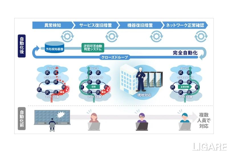 今回開発した運用自動化システムの特長は、迂回可否自動判定システムと予兆検知基盤だ。迂回可否自動判定システムでは、機器や関連システムから取得した設定情報やステータス情報、作業情報、アラーム情報をほぼリアルタイムに収集し、ネットワークの構成変化に特化したデジタルツイン上で状況を分析。これにより、実際の状態に基づいた自動判定を実現し、サービス復旧までの時間を大幅に短縮する。また、監視工数の削減や個人のスキルに依存しない安定的な運用体制の構築にも寄与しているという。一方、予兆検知基盤では、Telemetry(テレメトリー)※2を活用することで、機器の機能有無に依存せず多様なネットワーク機器を対象に、機器の状態や通信統計データなどを従来の約5倍の頻度で取得でき、より迅速かつ詳細な把握が可能になったとのことだ。