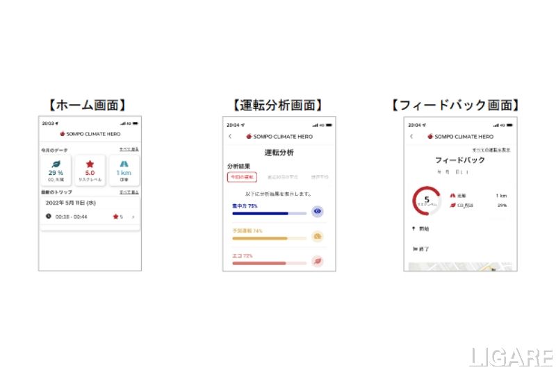 具体的には、ドライバーの持つスマートフォンにインストールした専用のアプリで車両の位置情報、運転の状況などを把握し、車両ごとの CO2(GHG)排出量を測定のうえ可視化する。さらに、車両の急発進・加速、急ブレーキや走行速度、運転挙動などの数値から、安全運転の指標を測り、ドライバーの運転に関わるリスク状況をスコア化する。測定結果は、ドライバー本人のスマートフォンと運行管理者が確認できる管理画面に表示される。これにより、どのドライバーに対して運転指導を実施すべきか確認できる。
