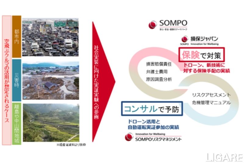 損保ジャパンは「空飛ぶクルマ」を、「多くの社会課題を解決するポテンシャルを秘めている」と評価。eVTOLメーカーのSkyDriveに出資して包括的な業務提携をし、2025年日本国際博覧会(大阪・関西万博)に向けた丸紅による実証実験でリスクアセスメントを行うなど多数の取り組み実績を持つ。
