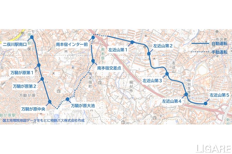 今回の実証実験は、横浜市の「I▫TOP横浜 路線バス自動運転プロジェクト」の一環として実施する。2021年3月に左近山団地で実施した試験走行区間を延伸するものだ。相鉄線二俣川駅と左近山団地間を走行する路線バスの一部区間の公道を、大型の自動運転バスを用いて営業運行する。駅に接続する自動運転バスの実証実験は、神奈川県内では初だ。