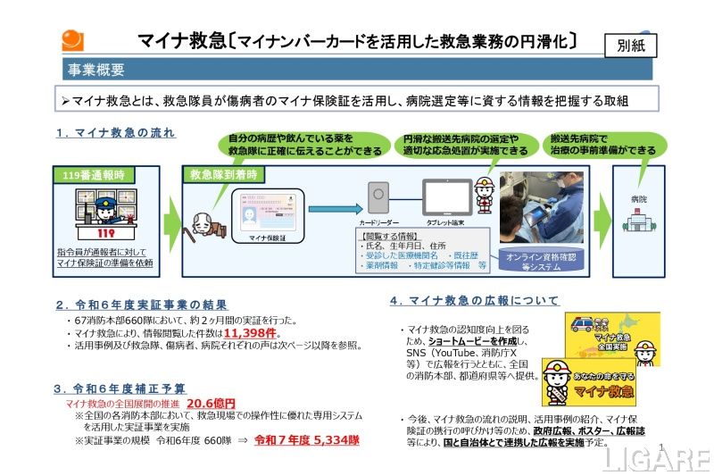 総務省、マイナ保険証を活用した救急実証の結果発表 特に意識不能時での有用性確認 会員限定記事 2026/3/11(水) Post Share Pocket RSS 総務省はこのたび、マイナ保険証を活用した救急業務の円滑化に係る2025年度実証事業実施消防本部の決定、および2024年度実証事業における活用事例を発表した。 ※このコンテンツは会員限定です。無料会員登録すると続きをお読みいただけます。 会員登録済みの方はログインしてください。 ログイン ログイン メールアドレス パスワード ログイン情報を記憶 新規ユーザー登録 パスワードをお忘れですか ? LIGARE編集部h.s ヘルスケア医療総務省 Post Share Pocket RSS 関連記事: 湘南アイパークら、ヘルスケアMaaSに関する実証実験等を開催 ダイハツら、大阪府と災害時の要援護難病児者等への電源供給協定締結 日本通運らが出資 健康管理のenstem社、2.5億円の資金調達成功 健康起因事故防止・解決関連取り組みまとめ【2025年1月~8月】 glafitと舘山寺温泉観光協会、特定小型原付を活用した回遊実証実験を実施。「浜名湖花フェスタ2026」と連動 経団連、審議員会議長・副議長候補者内定 議長にANAホールディングス会長の片野坂真哉氏