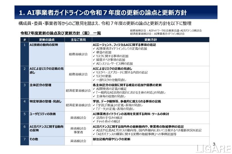 総務省・経産省、AI事業者ガイドラインを更新 AIエージェントやフィジカルAIの便益・リスク等追記 会員限定記事 2026/3/16(月) Post Share Pocket RSS 総務省および経済産業省は3月12日、AI事業者ガイドラインの更新を発表した。 ※このコンテンツは会員限定です。無料会員登録すると続きをお読みいただけます。 会員登録済みの方はログインしてください。 ログイン ログイン メールアドレス パスワード ログイン情報を記憶 新規ユーザー登録 パスワードをお忘れですか ? LIGARE編集部h.s AI経産省総務省観光 Post Share Pocket RSS 関連記事: 国交省 スマートシティモデル事業始動 71団体を選定 SWATのモビリティ関連取り組みまとめ【2022年~2023年10月】 KDDIとアビスパ福岡、生成AIを活用した観光プラン提案の実証開始 WILLER、MaaS実証を丹後地域4市町で実施 ライドシェアを含めた横断的な経路検索が可能に 国交省採択事業 タクシー業界で自動運転も視野に入れた人材育成 つばめあんしんネット、3つのキャリアコース新設 Honda、四輪電動化戦略を大幅見直し。北米でのEV3車種開発中止とハイブリッド強化へ