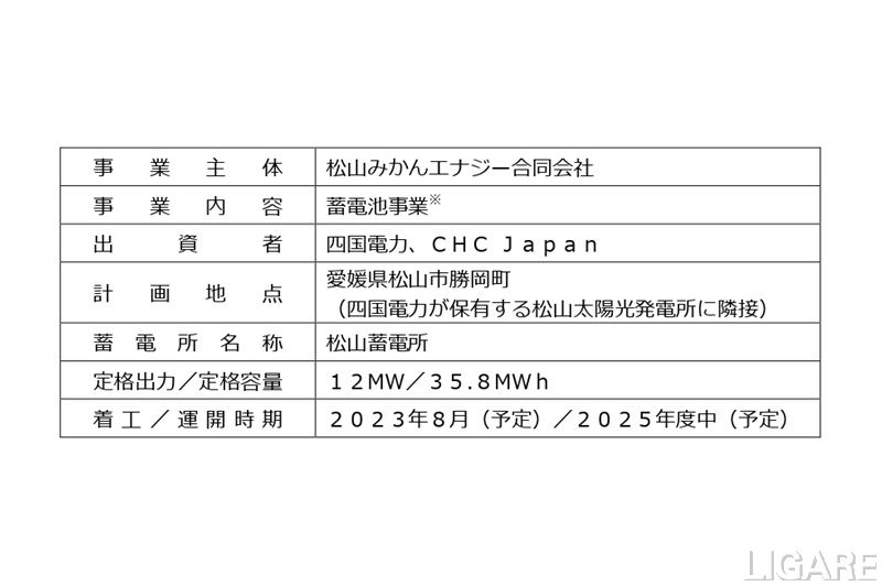 四国電力およびCHC Japan株式会社(以下、CHC Japan)は6月14日、愛媛県松山市における蓄電池事業の実施に向けた事業会社「松山みかんエナジー合同会社」を共同で設立したと発表した。
