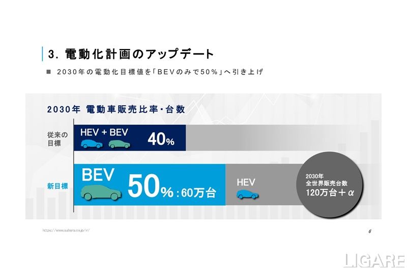 株式会社SUBARU(以下、SUBARU)は8月2日、新経営体制における方針について発表した。同社は、この中で、2030年の電動車販売比率を「バッテリーEVのみで50%」へ引き上げ、120万台の全世界販売台数に対して「60万台のバッテリーEVを販売することによって実現する」という目標に見直している。