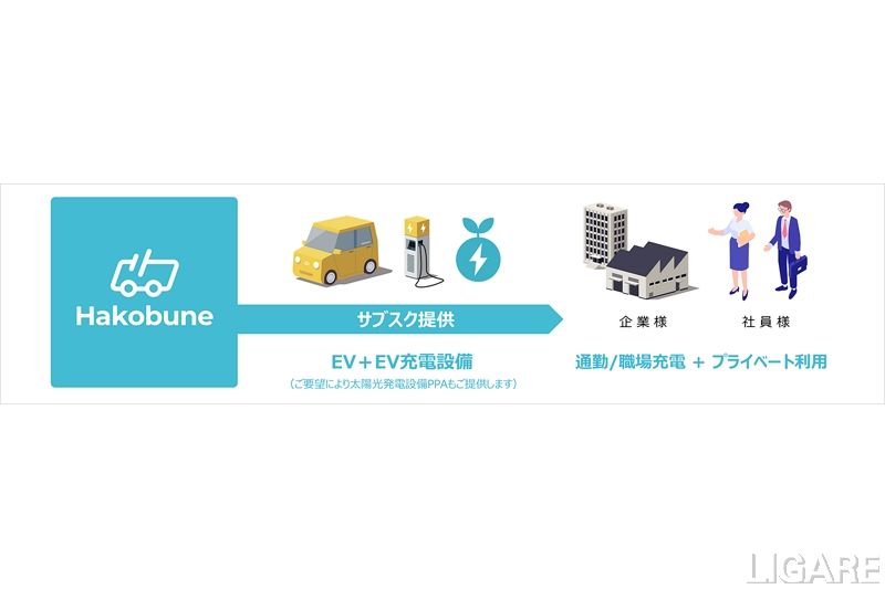 Hakobuneが提供するサービスでは、まず同社とその関連企業が、EV、充電設備および太陽光発電設備を契約企業へリースする。契約企業は、これまでの通勤手当に代わり、EVやWPC環境を従業員に提供する。これにより、従業員はマイカー購入が不要となり、日々の給油の手間といった不便さがなくなり、帰宅後はEV内の残りの電力を生活利用することも可能になる。さらに、EVの充電を職場で行うため、自宅や近隣に充電設備がなくても通勤に利用することができる。このため、契約企業は、従業員の利便性を向上するとともに、サステナブルな通勤体制を素早く実装することが可能となる。