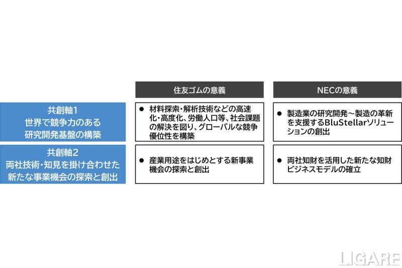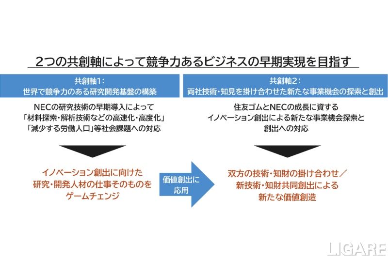一方、両社技術・知見を掛け合わせた新たな事業機会の探索と創出では、住友ゴムが保有する高機能ゴムに関する技術をNECの事業分野に応用・適用することや、NECが保有するAI技術を住友ゴムが手掛ける新事業へ適用することを検討。さらに、「世界で競争力のある研究開発基盤の構築」において取り組む、マテリアルズ・インフォマティクス※などの先端ICTを活用したDX推進により、知財の迅速な創出を目指していくとのことだ。