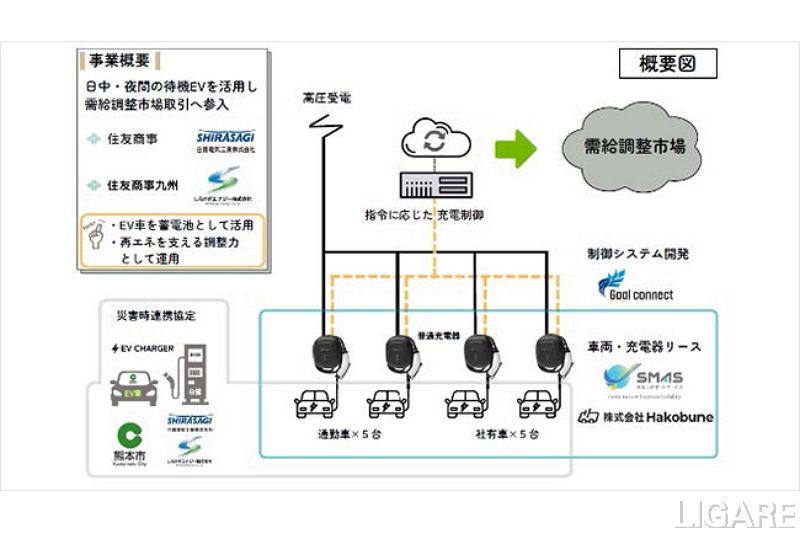 今回の取り組みは、EVをさまざまな用途で実際に利用しつつ、さらにバッテリーとして活用。電力系統の需給バランスを調整する蓄電池の役割を担わせ、電力市場に提供するというものだ。具体的には、EVが駐車場に止まっている非稼働時間帯に、バッテリーを蓄電池として活用し、充電器へ送信される指令に応じて調整力を提供する。使用するEVは、住友商事のグループ会社である住友三井オートサービス株式会社および株式会社Hakobuneから、熊本市の白鷺電気工業株式会社およびしらさぎエナジー株式会社にリースされているものだ。また、同取り組みに関連するシステムの開発は、Goal connect株式会社に委託しているという。