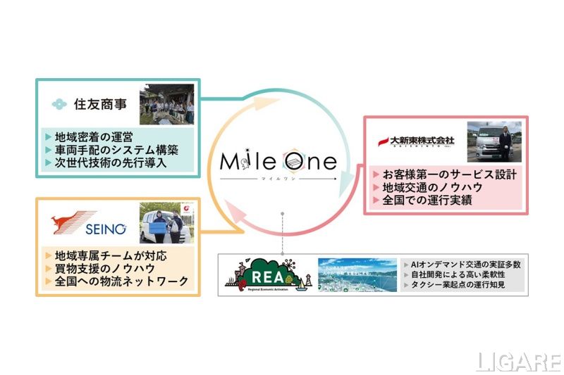 住友商事、セイノーホールディングス(以下、セイノーHD)、大新東、REA社は8月12日、国土交通省による「共創モデル実証運行事業」※1 の採択を受け、2025年10月1日から山口県下関市豊田町(以下、豊田町)で、産官学連携の取り組みとしては国内初となるAIオンデマンドシステム※2 と貨客混載※3 を組み合わせた地域モビリティサービス「Mile One(マイルワン)」の実証実験開始を発表した。