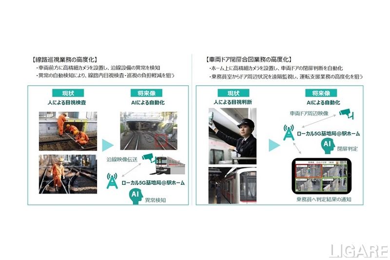 具体的には、列車や駅のホームに設置した高精細4Kカメラで撮影した映像をローカル5Gで伝送し、AIで解析する。これにより、目視で行っていた線路巡視業務および車両ドア閉扉合図業務の効率化・高度化を目指す。これらの有効性の検証およびローカル5Gの性能評価などを実施し、課題の抽出や今後の実装および普及に向けた検討を行う。