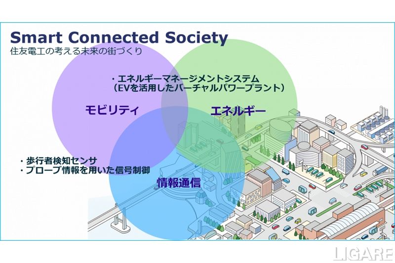 住友電工は、人・物・社会インフラが有機的に結びついた、人と自然にとって温かい社会”Smart Connected Society”の実現をテーマに掲げている。同会議では、情報通信・エネルギー・モビリティを融合したソリューションを紹介する。