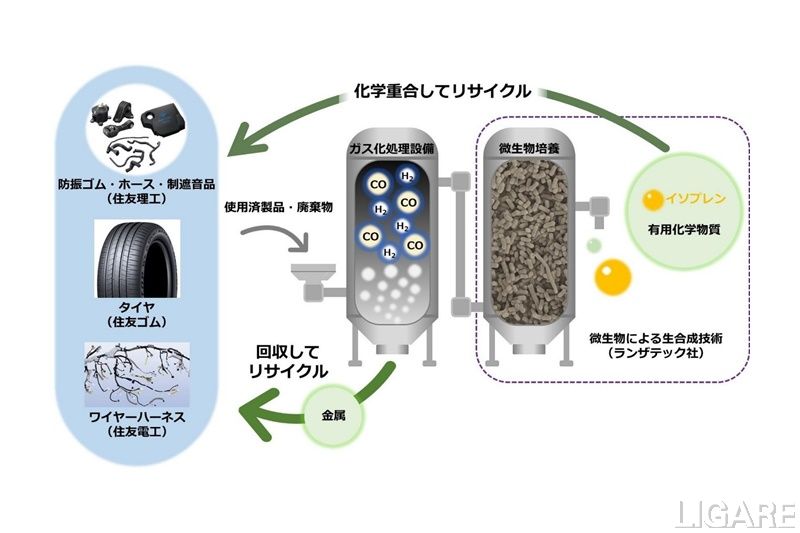 具体的には、ランザテック社が有する「微生物による生合成技術」を活用し、住友理工の製品などの廃棄物をガス化・ガス精製する。その後、微生物による生合成反応を経て、新たにゴム原料となるイソプレンを生産することを目指す。最終的には、原料メーカーとの協業を進め、イソプレンを再び、ゴム・樹脂として利用するリサイクル技術の確立も視野に入れているとのことだ。また、廃棄物をガス化する過程で回収した金属をリサイクルし、原材料として再利用することを検討していくという。
