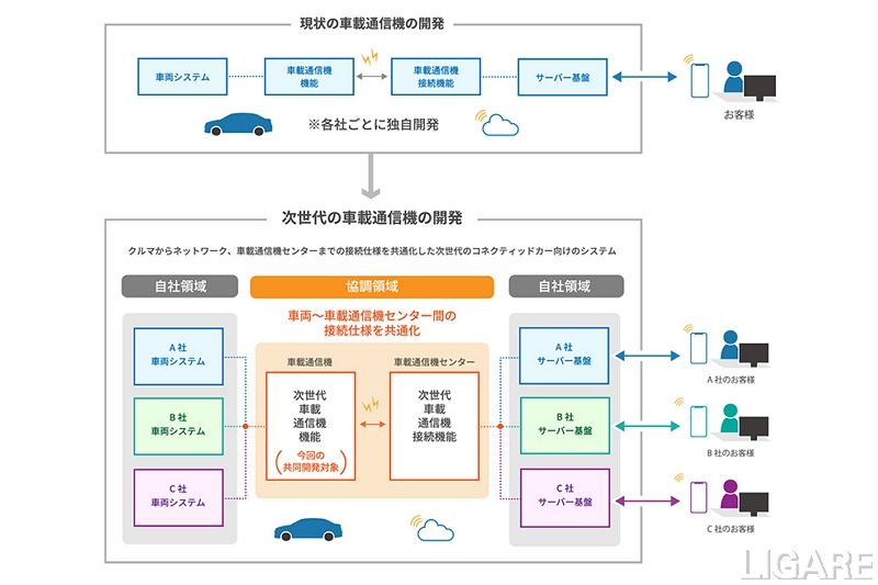 今回の基本合意の目的は、より安全で快適なコネクテッドサービスを、ユーザーに早期に提供することだ。「つながるクルマ」の基本機能である車載通信機の開発を協調領域、アプリケーションやサービス面での開発を自社領域と位置づけ、車載通信機の開発の効率化・加速化を実現する。これにより各社は、共通基盤上でのアプリケーションやサービス面での開発に、より力を注ぐことが可能になる。