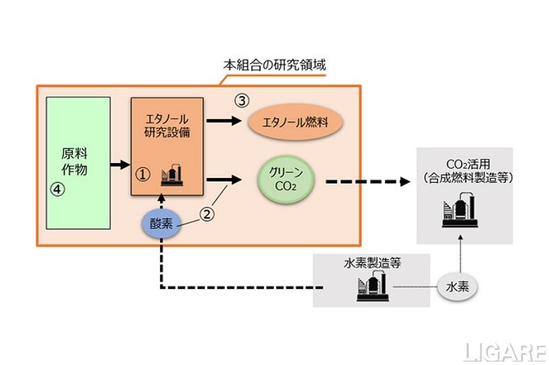 具体的には、「エタノールの効率的な生産システムの研究」、「副生酸素とCO2の回収・活用の研究」、「燃料活用を含めたシステム全体の効率的な運用方法の研究」、「効率的な原料作物栽培方法の研究」の4つに取り組む。