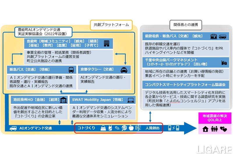 また、今回の実証運行では、5者で共創プラットフォームを構成し、AIオンデマンド交通の運行(地域交通の利便性向上)と「コトづくり」を連携した利用促進を図る。そして、地域活性化、人流創出の増進につなげるとともに、利用データの収集および人流分析により、公共交通の最適化と地域住民の生活の質(QOL)向上を目指す。なお、今回の実証運行は、大阪府AIオンデマンド交通モデル事業費補助金、国土交通省共創モデル実証プロジェクト(共創モデル実証運行事業)補助金を活用して行うとのことだ。