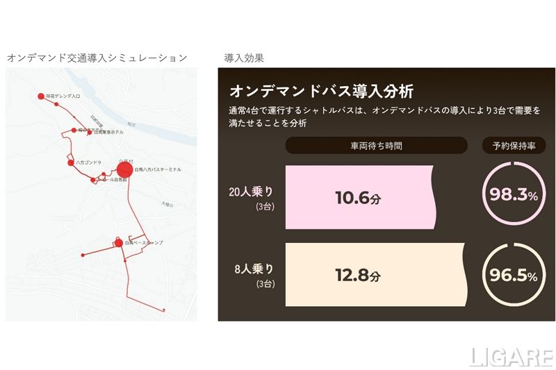 4者は、ウインターシーズンに運行していた路線バス「白馬シャトル」の乗降データ分析やオンデマンド交通導入シミュレーションにより、運行改善を提案。その結果、元々4台で運行していたバスをオンデマンド交通に置き換えることで、3台で需要を満たすことができると判明した。さらに、予約成立率も非常に高くなるという。
