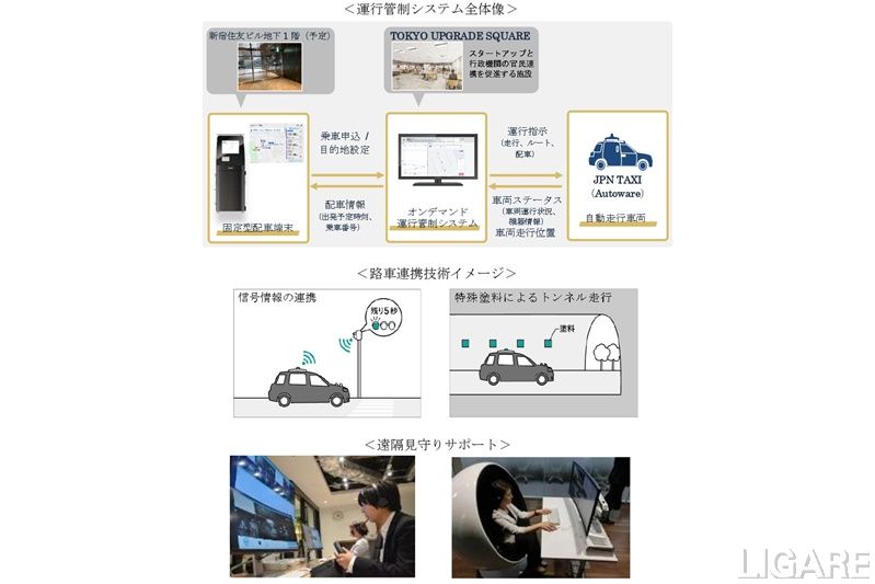 さらに、今回の実証では、「安心・安全なサービスのための取り組み」と「街の活性化のための取り組み」を実施する。具体的な取り組みとしては、「安心・安全なサービスのための取り組み」では、固定型配車端末の運用、TOKYO UPGRADE SQUAREからの遠隔監視を実施する。くわえて、路車連携では、信号情報の連携、トンネル走行支援技術等、路車間連携技術の導入を行う。さらに、コネクテッドサポートセンターからの遠隔見守りサポートも実施する予定だ。