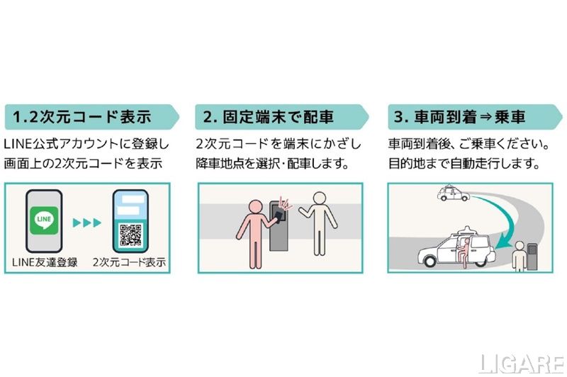 同車両は、LINE公式アカウントで発行される2次元コードを固定端末にかざすことで配車可能だ。