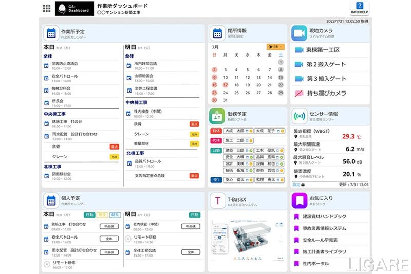 「作業所ダッシュボード」では、「作業所内での各種工事の実施予定」、「作業所閉所情報、日報(本社・支店への毎日の業務報告・連絡)」、「職員個人予定(Microsoft Office Outlookとの連携)」、「建設現場内に設置したカメラ映像」などを共有できる。