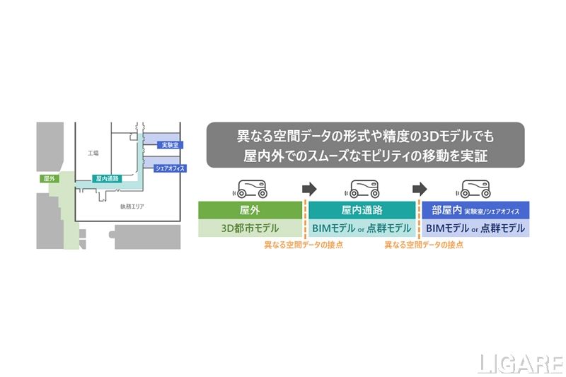 また、パーソナルモビリティを走行する実証を、CGLLにて2022年11月から実施する。パーソナルモビリティの建物内外連続での自律走行、デジタルツインを活用した円滑な自律走行の効果検証、3D都市モデルと3D建物モデルとの統合手法の開発、都市レベルのデジタルツイン構築と社会実装に向けたガイドラインの作成などを行う予定だ。