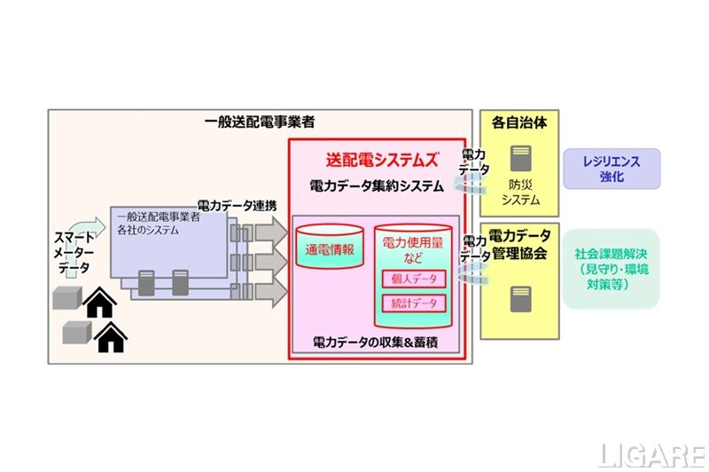 具体的には、電力データ集約システムでは、一般送配電事業者が保有する電力使用量等の電力データを集約して、自治体や電力データ管理協会を通してデータ利用事業者に提供する。これにより、災害時の事故対策や早期復旧等レジリエンス強化、および平時の高齢者等の見守りや環境対策等の社会課題の解決が期待されている。